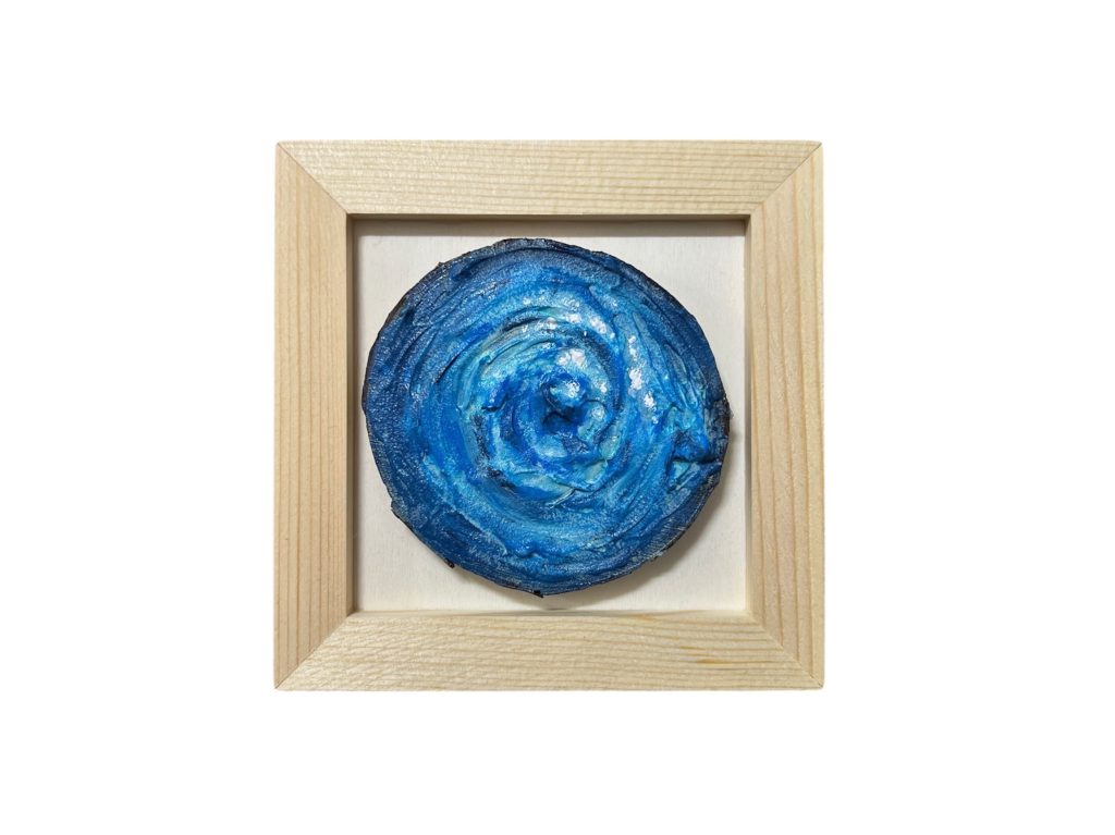 Destellos Cuando nos da por brillar y bailar sobre el agua, hasta las estrellas nos envidian a años luz. Pensé en pintar esos destellos vistos bajo el agua y apareció esto. Ficha técnica Mixta sobre rodaja de madera Diámetro de 7cm aprox. Más artículos:Nits d'estiu (2023)Sentido (2024)Desde aquí