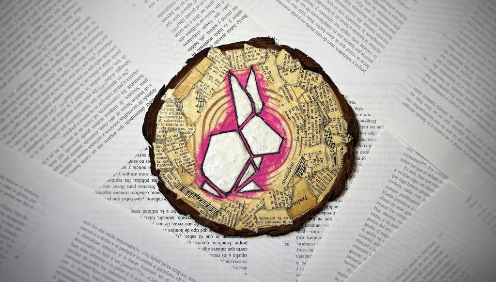 Con esta «Follow the white rabbit» he querido relacionar todos los elementos que confluyen en un proceso creativo de escritura: la madera que es el material básico para obtener el papel; los fragmentos de libros anteriores que envuelven el centro de esa pieza, que son el marco, el perímetro o su fortaleza; el conejo de Rapitbook que sobresale de la madera y se superpone a todos ellos, y en el fondo, muchas cuartillas con letras, párrafos, secciones y capítulos, que representan los cientos de autores y autoras que apostamos por la editorial, y que seguiremos confiando en su buen trabajo.
